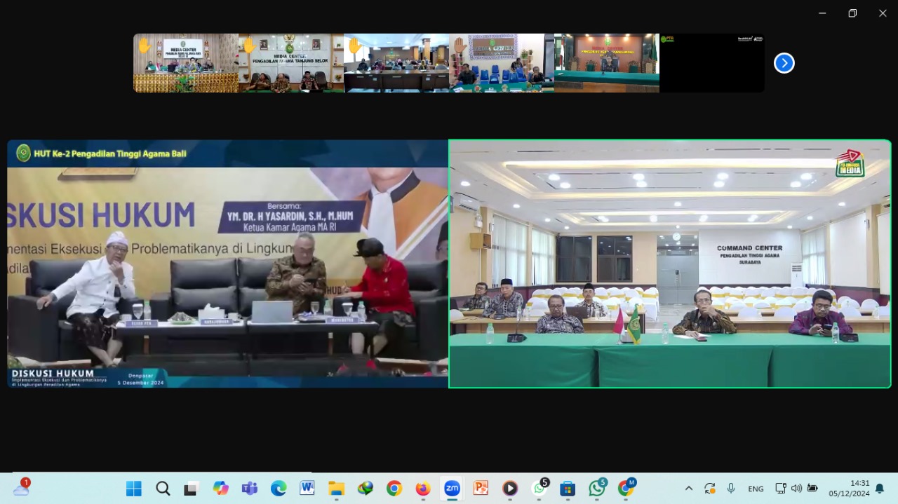 Bertempat diruang Media Center, Wakil Ketua Pengadilan Agama Purbalingga Bapak H. Moh. Muhibbuddin, S.Ag., S.H., M.S.I., beserta tenaga teknis mengikuti diskusi hukum dalam rangka HUT Ke-2 PTA Bali pada Kamis 05/12 pukul 13.00 WIB berdasarkan surat undangan nomor : 3893/DJA.2/HM2.1/XII/2024 tanggal 4 Desember 2024.