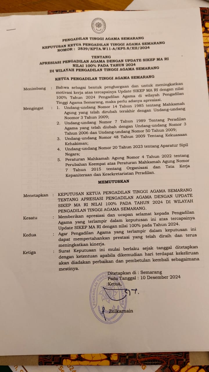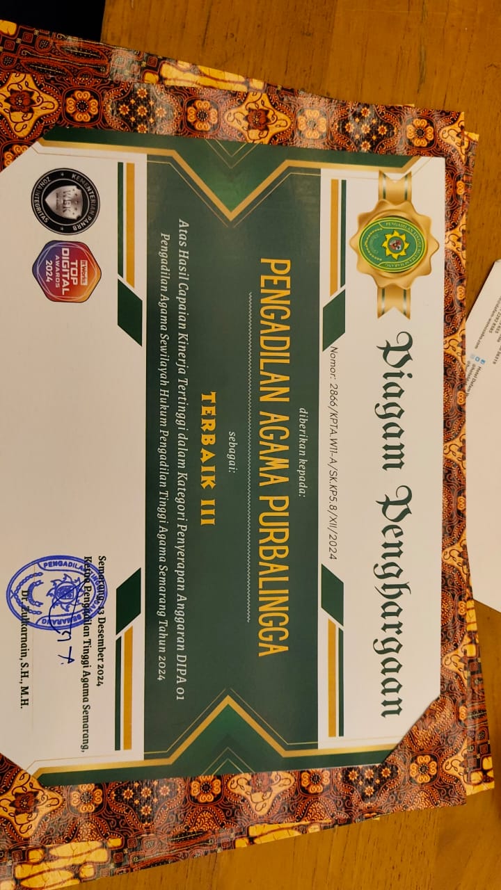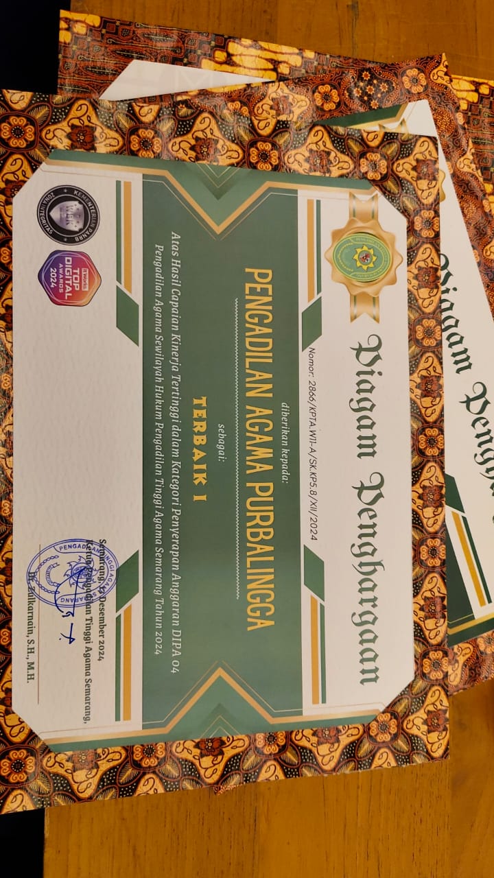 Pengadilan Agama Purbalingga kembali menorehkan prestasi membanggakan. Dalam acara rapat koordinasi dan anugerah PTA Semarang award yang berlangsung di Hotel Dafam Wonosobo, Ketua Pengadilan Agama Purbalingga berhasil membawa pulang 6 (enam) penghargaan. Penghargaan ini diserahkan langsung kepada Ketua PA Purbalingga di hadapan Ketua Pengadilan Agama se wilayah PTA Semarang.