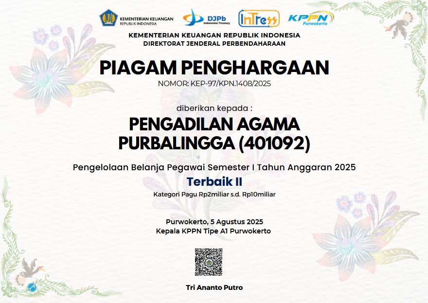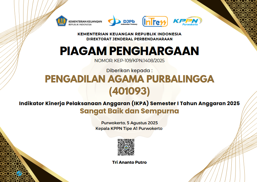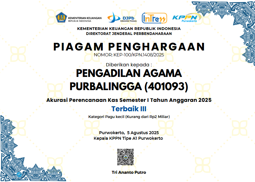 Pengadilan Agama Purbalingga kembali menorehkan prestasi membanggakan. Dalam acara rapat koordinasi evaluasi kinerja pelaksanaan anggaran semester I TA 2025 yang berlangsung di Purwokerto, Jum'at 15/08 Pengadilan Agama Purbalingga berhasil meraih 5 penghargaan dari Kantor Pelayanan Perbendaharaan Negara (KPPN) Purwokerto. Kategori yang berhasil diraih oleh Pengadilan Agama Purbalingga antara lain: Terbaik III Kuasa Pengguna Anggaran Semester I Tahun Anggaran 2025, akun 401092 dan 401093 Indikator Kinerja Pelaksanaan Anggaran (IKPA) Semester I Tahun 2025 dengan kategori Sangat Baik dan Sempurna, Akurasi Semester I Dengan Perencanaan terbaik III akun 401093, serta akun 401092 pengelolaan belanja pegawai terbaik II semester 1 tahun anggaran 2025.